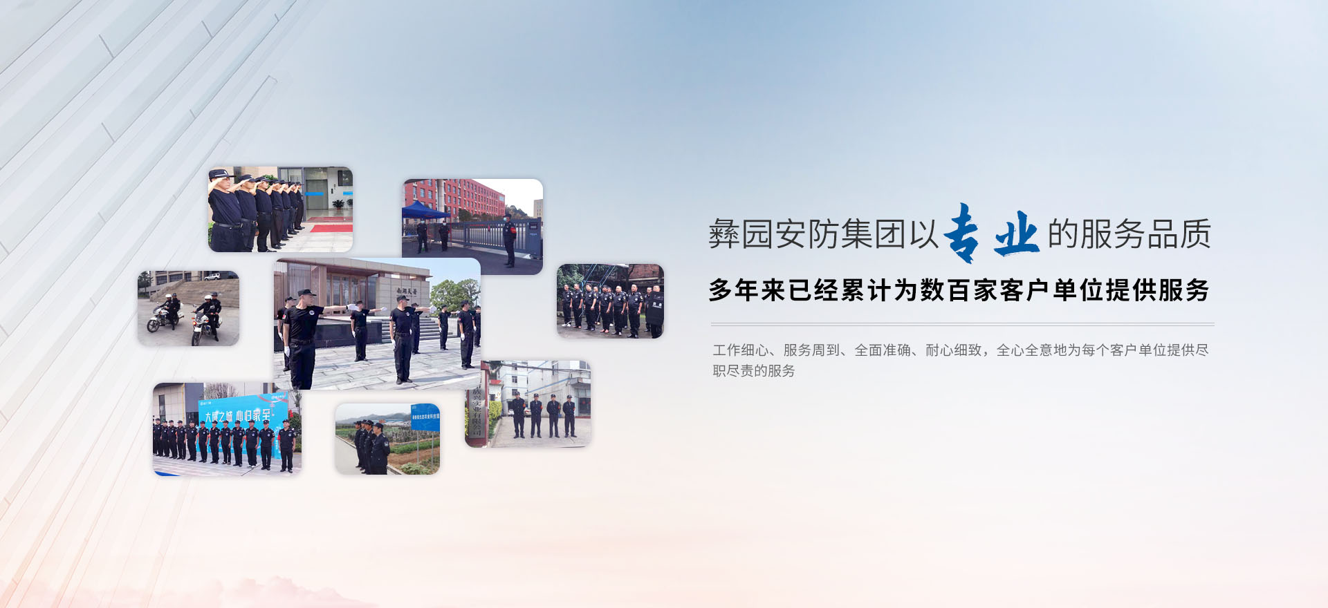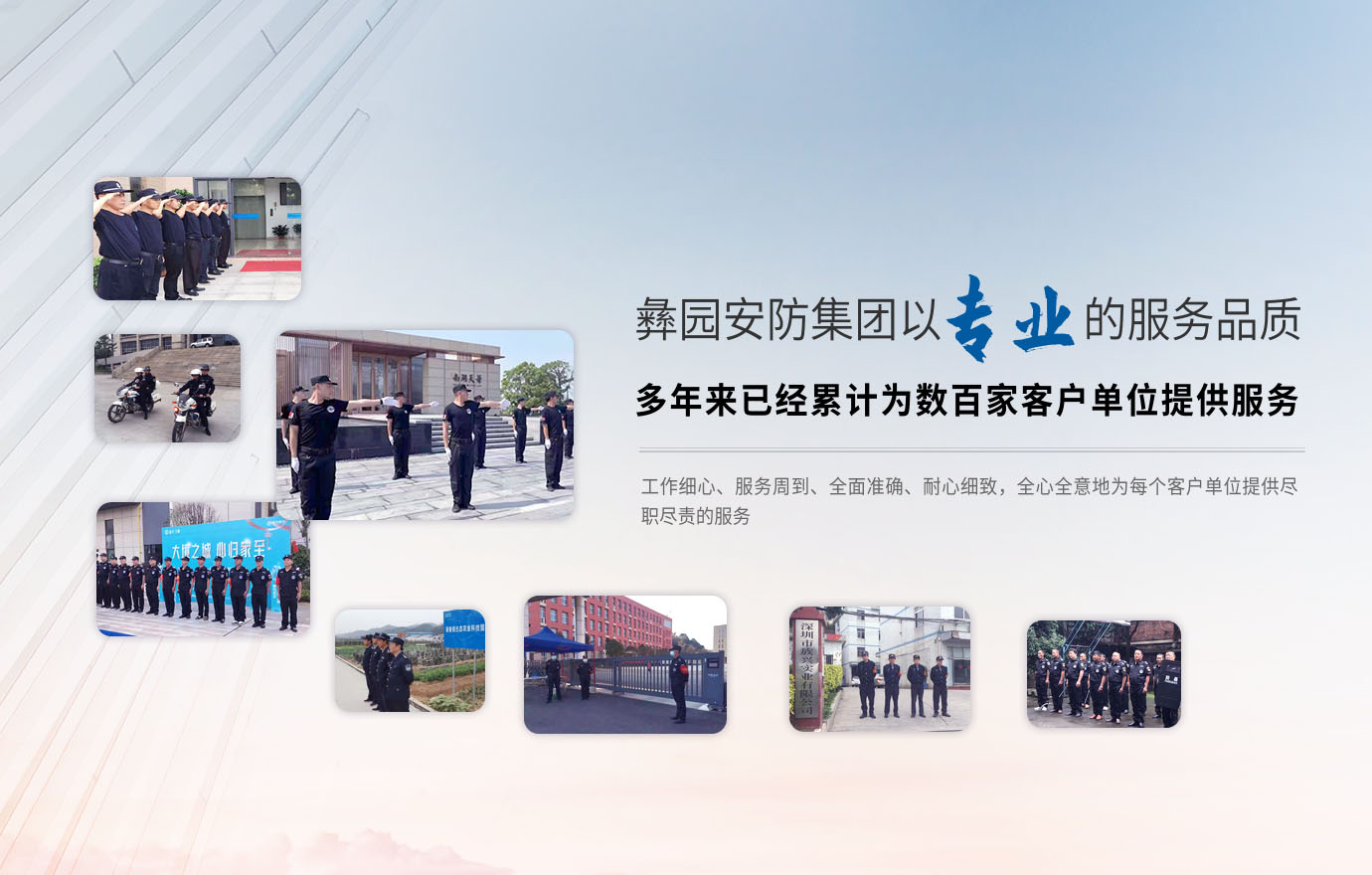 公司有專(zhuān)業(yè)的保鏢精英團(tuán)隊(duì),對(duì)特種保鏢、貼身保鏢、私人保鏢、高級(jí)保鏢等特衛(wèi)安全工作有著豐富的實(shí)戰(zhàn)經(jīng)驗(yàn)人員組成,良好軍人作風(fēng)和職業(yè)道德,敏捷快速的反應(yīng)